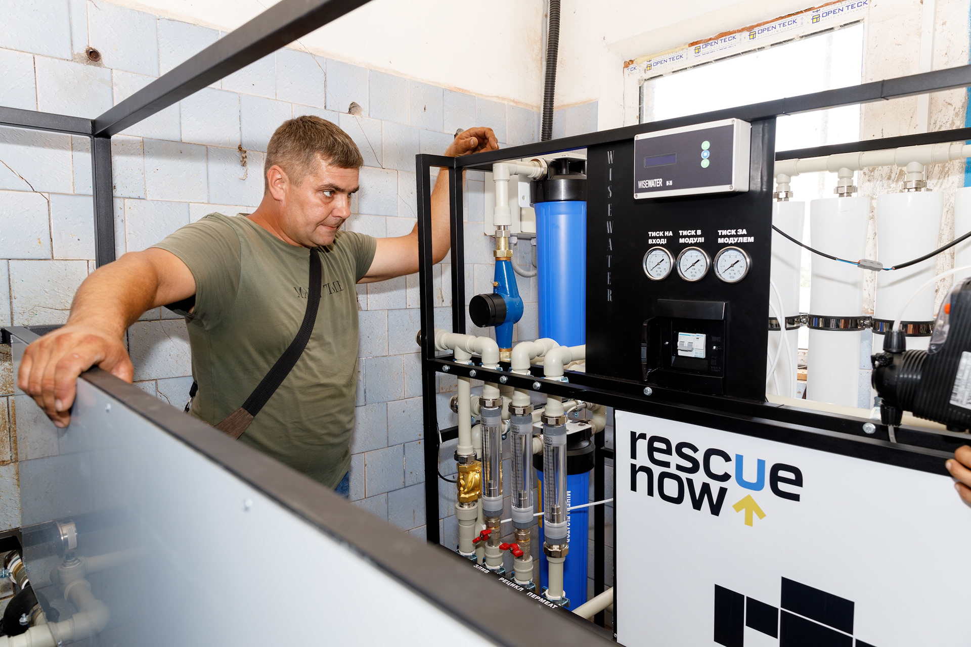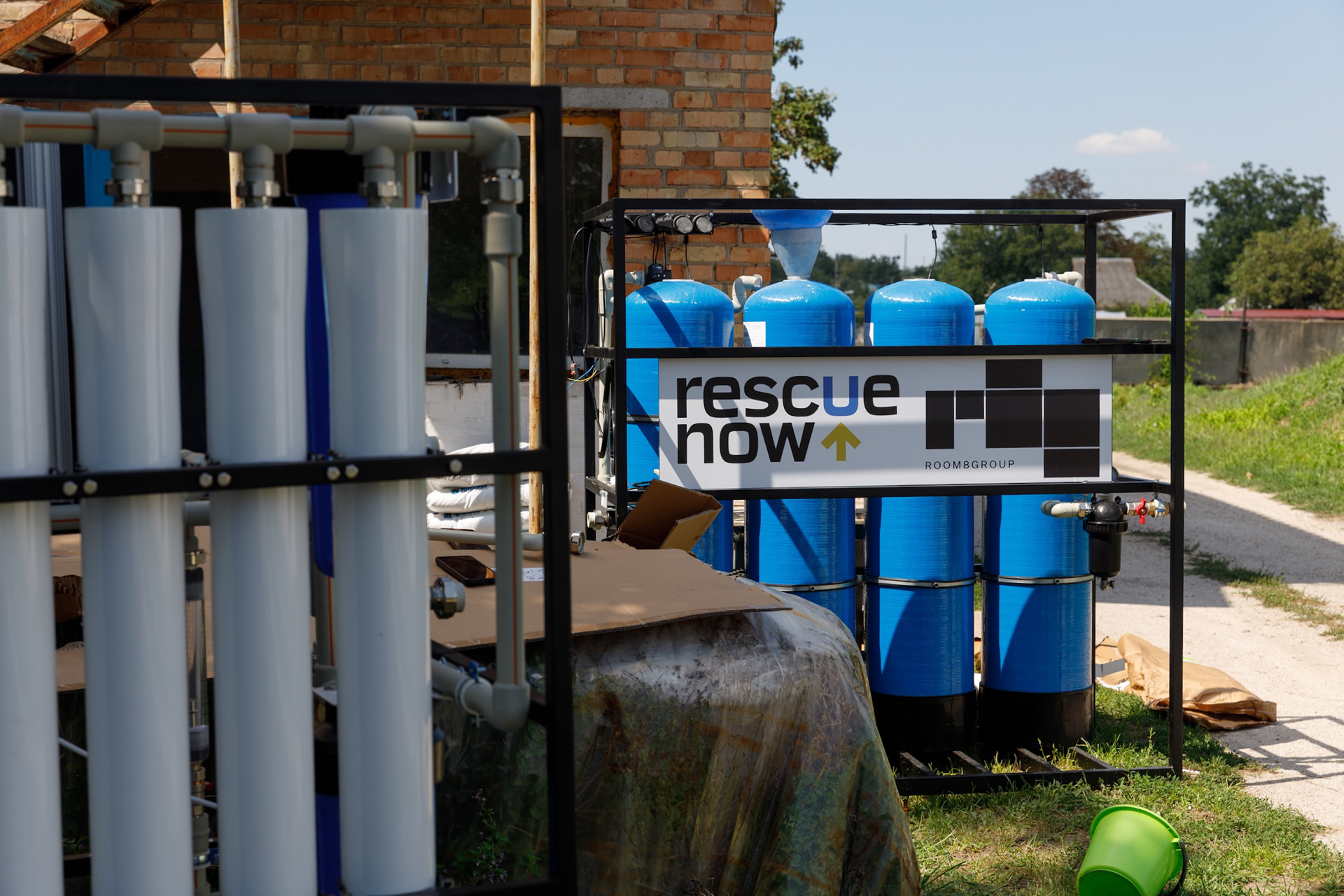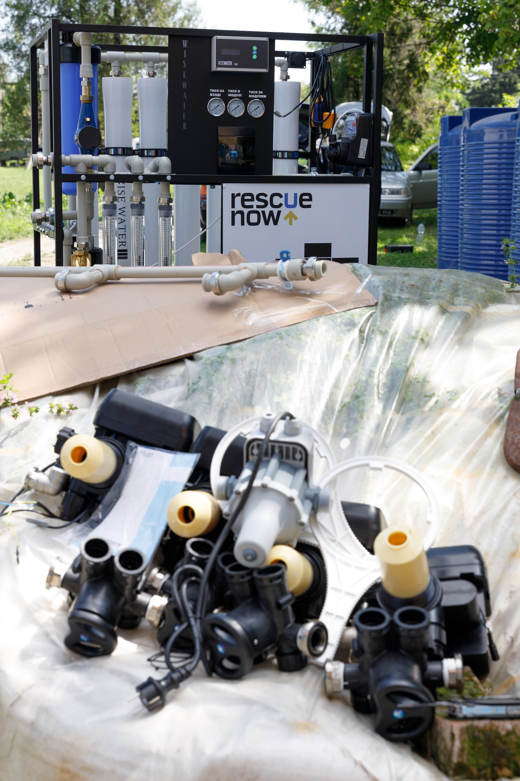 Photos of water purification systems installation by Rescue Now in Nikopol district. The area has been left without high-quality water due to terrorist act on Kakhovka Dam.